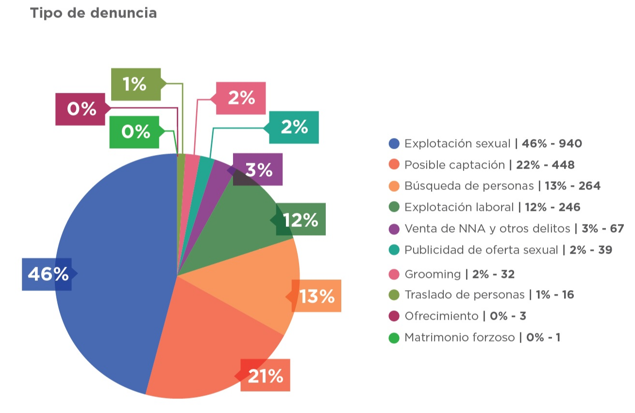 Algunos datos que se desprenden del informe son: que, con el 46%, las sospechas por explotación sexual representan la categoría más denunciada, seguida por la posible captación de personas, con el 22%.