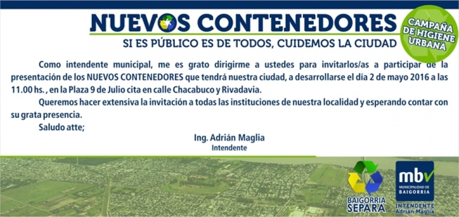 De esta forma, el lunes 2 de mayo, se presentará la Primera Etapa de Contenerización Local, con la instalación de 32 contenedores plásticos que estarán dispuestos en barrio Centro.