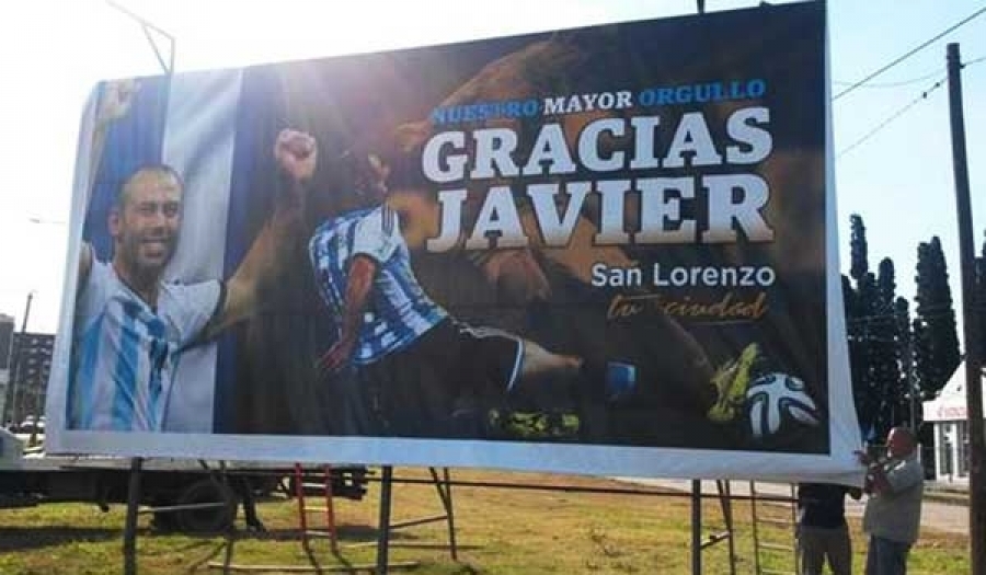 En la imagen se ve a Mascherano llorando tras pasar a la final contra Holanda y el slogan: “Nuestro mayor orgullo, gracias Javier. San Lorenzo, tu ciudad.”